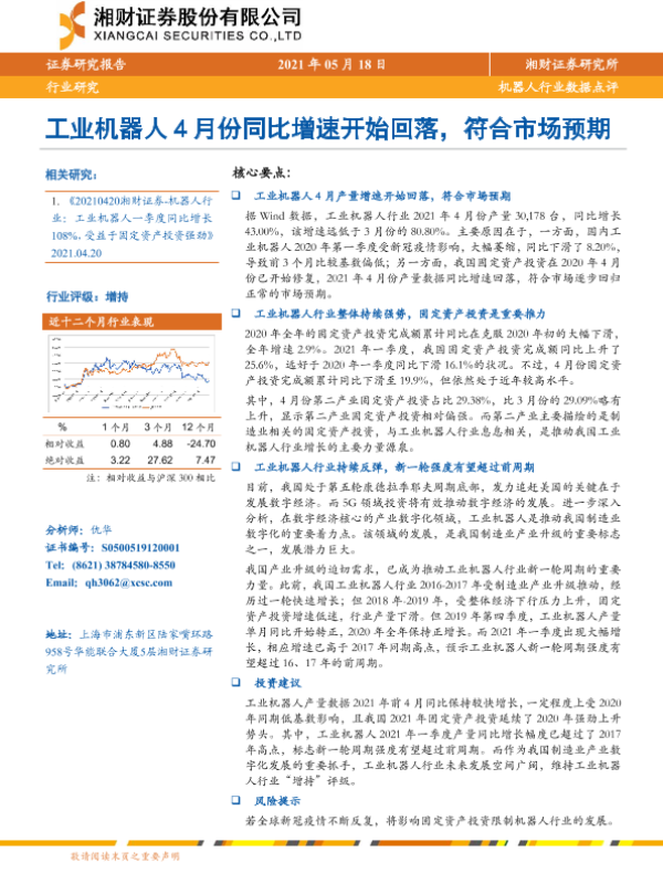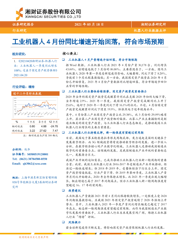 【湘财证券】【20210518】机器人行业数据点评:工业机器人4月份同比增速开始回落,符合市场预期-4页