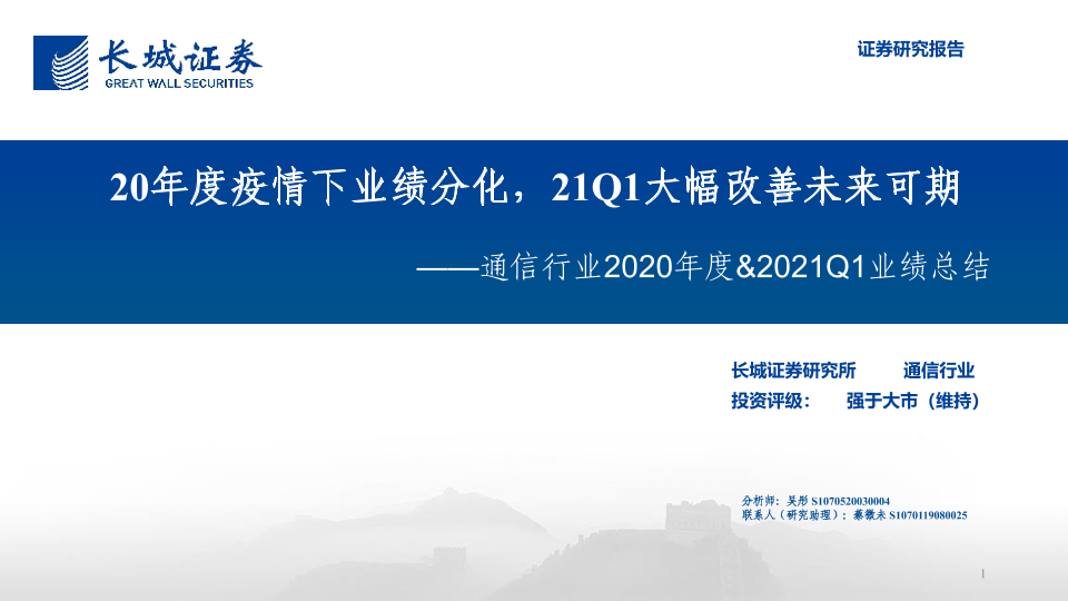 【长城证券】【20210519】通信行业2020年度&2021Q1业绩总结:20年度疫情下业绩分化,21Q1大幅改善未来可期-44页