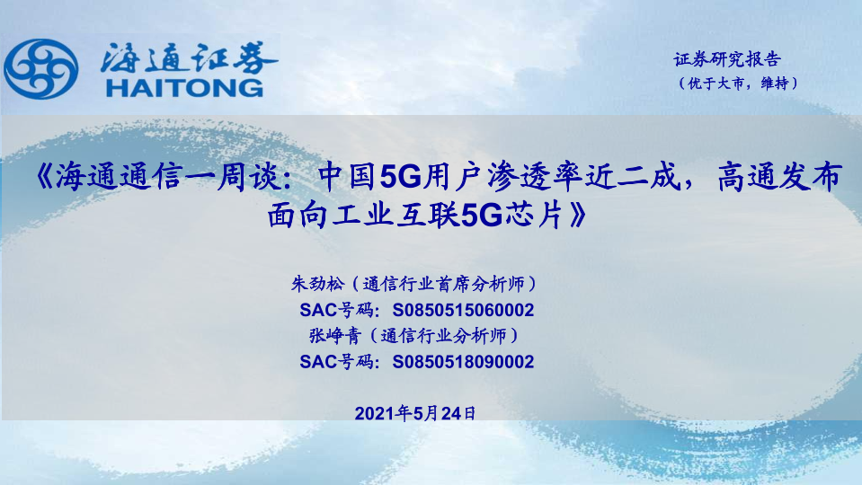 【海通证券】【20210524】海通通信一周谈:中国5G用户渗透率近二成,高通发布面向工业互联5G芯片-11页