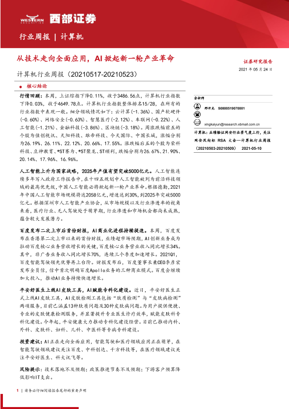 【西部证券】【20210524】从技术走向全面应用,AI掀起新一轮产业革命-16页