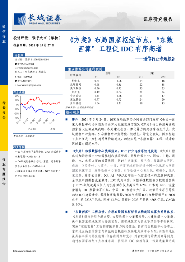 【长城证券】【20210527】通信行业专题报告:《方案》布局国家枢纽节点,“东数西算”工程促IDC有序高增-4页
