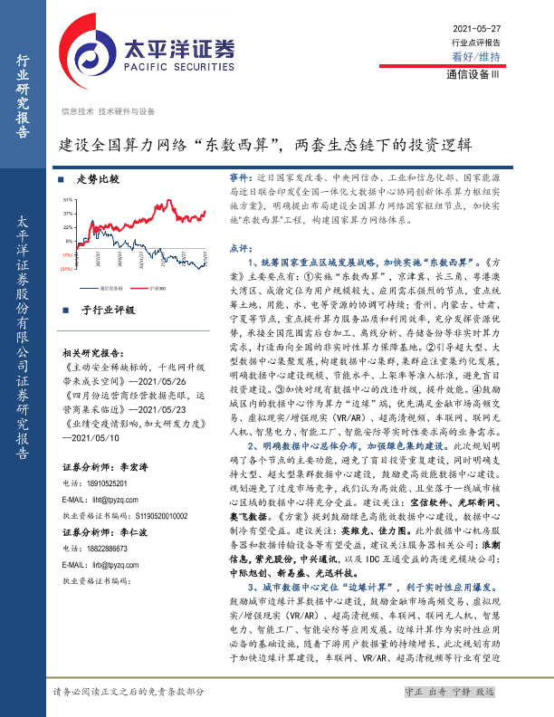 【太平洋证券】【20210527】建设全国算力网络“东数西算”,两套生态链下的投资逻辑-5页