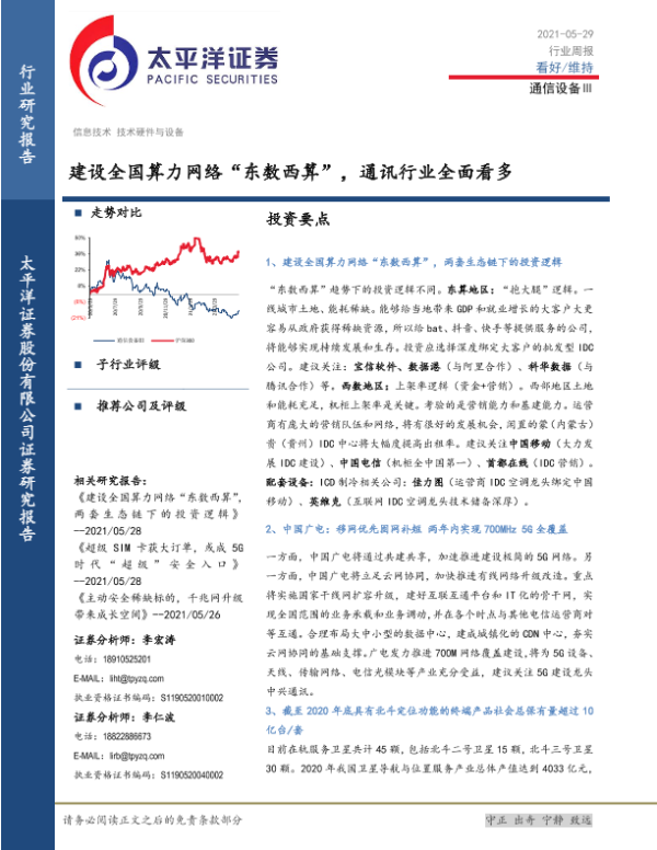 【太平洋证券】【20210529】20210529-太平洋-通信设备Ⅲ行业周报:建设全国算力网络“东数西算”,通讯行业全面看多-14页