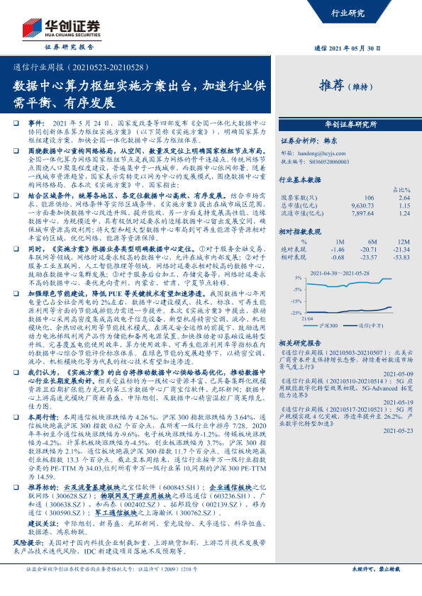 【华创证券】【20210530】通信行业周报:数据中心算力枢纽实施方案出台,加速行业供需平衡、有序发展-19页