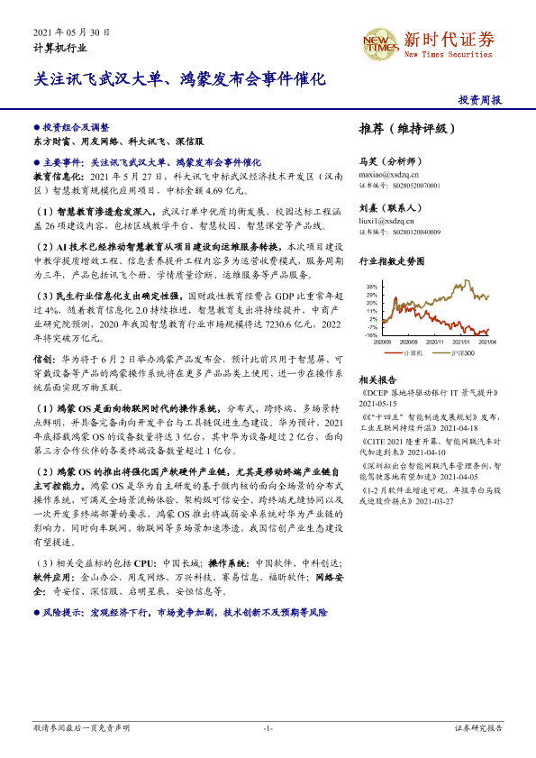 【新时代证券】【20210530】计算机行业投资周报:关注讯飞武汉大单、鸿蒙发布会事件催化-17页