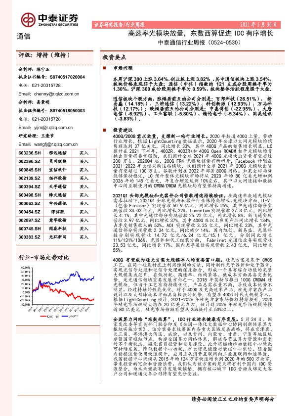 【中泰证券】【20210530】中泰通信行业周报:高速率光模块放量,东数西算促进IDC有序增长-15页