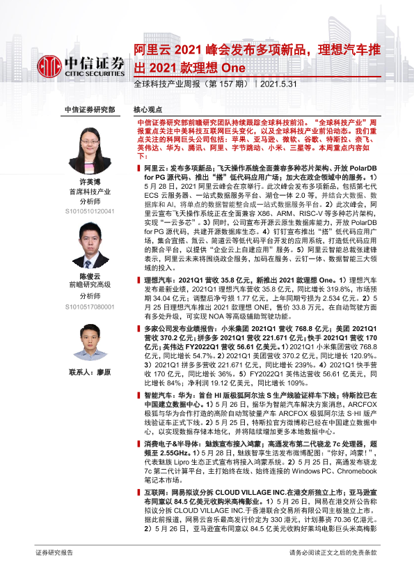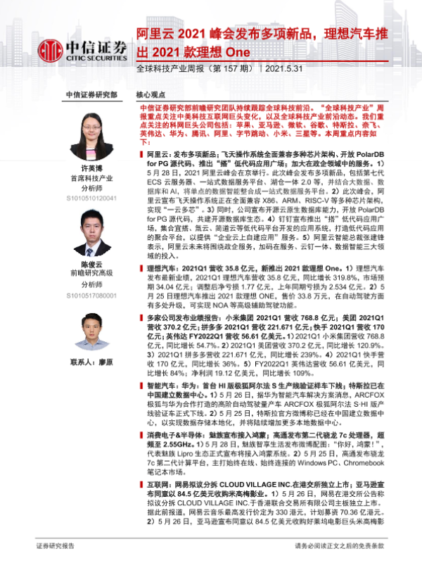 【中信证券】【20210531】全球科技产业周报(第157期):阿里云2021峰会发布多项新品,理想汽车推出2021款理想One-18页