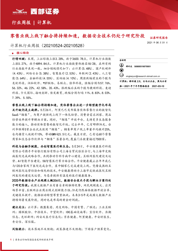 【西部证券】【20210601】20210601-西部证券-计算机行业周报:零售业线上线下融合将持续加速,数据安全技术仍处于研究阶段-16页