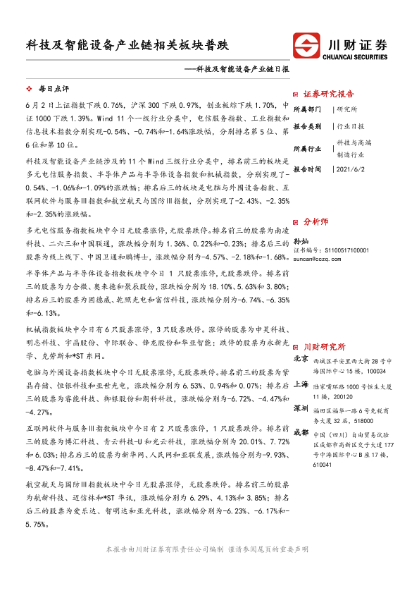【川财证券】【20210602】科技及智能设备产业链日报:科技及智能设备产业链相关板块普跌-7页