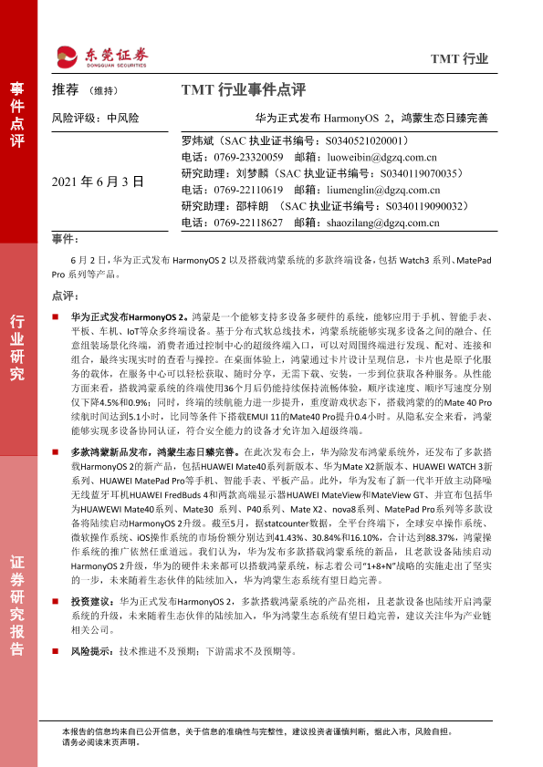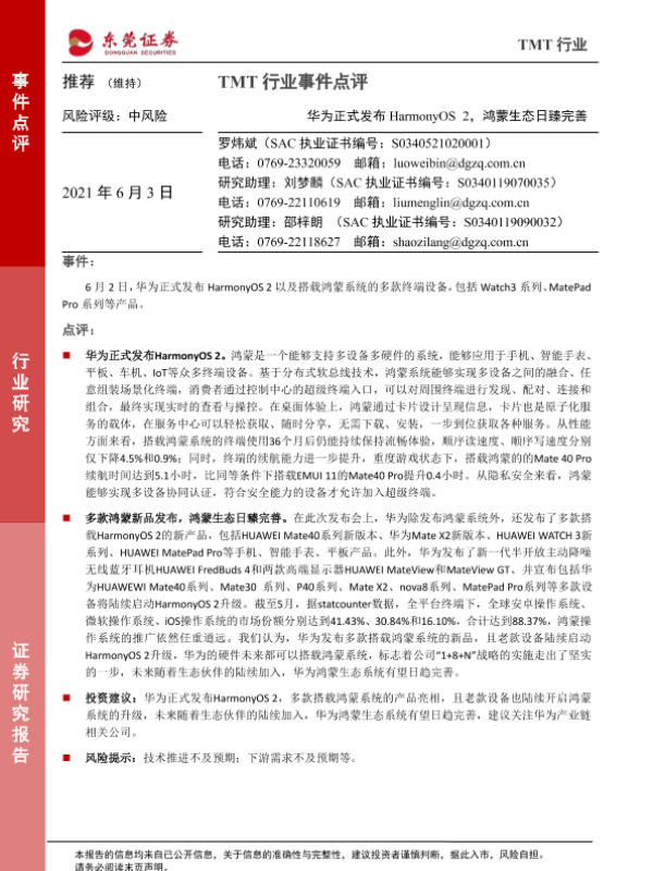 【东莞证券】【20210603】TMT行业事件点评:华为正式发布HarmonyOS 2,鸿蒙生态日臻完善-3页