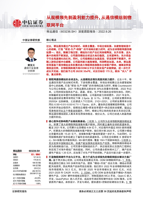 【中信证券】【20220926】移远通信-603236-深度跟踪报告:从规模领先到盈利能力提升,从通信模组到物联网平台-31页