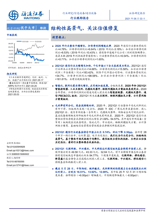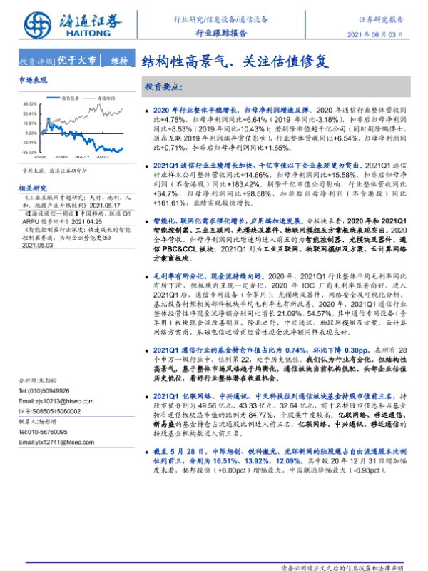 【海通证券】【20210603】20210603-海通证券-通信设备行业跟踪报告:结构性高景气、关注估值修复-20页