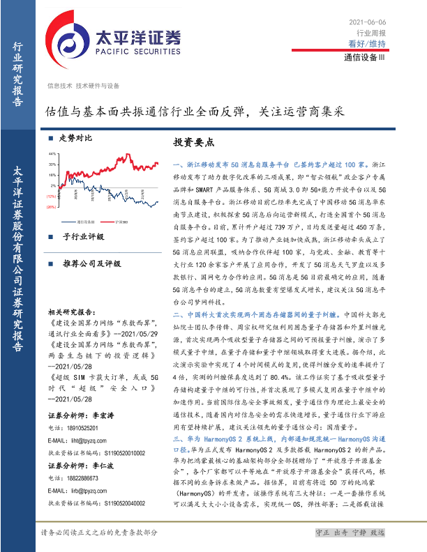 【太平洋证券】【20210606】20210606-太平洋-通信设备Ⅲ行业周报:估值与基本面共振通信行业全面反弹,关注运营商集采-20页