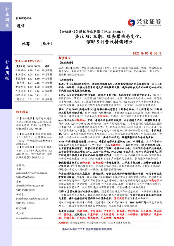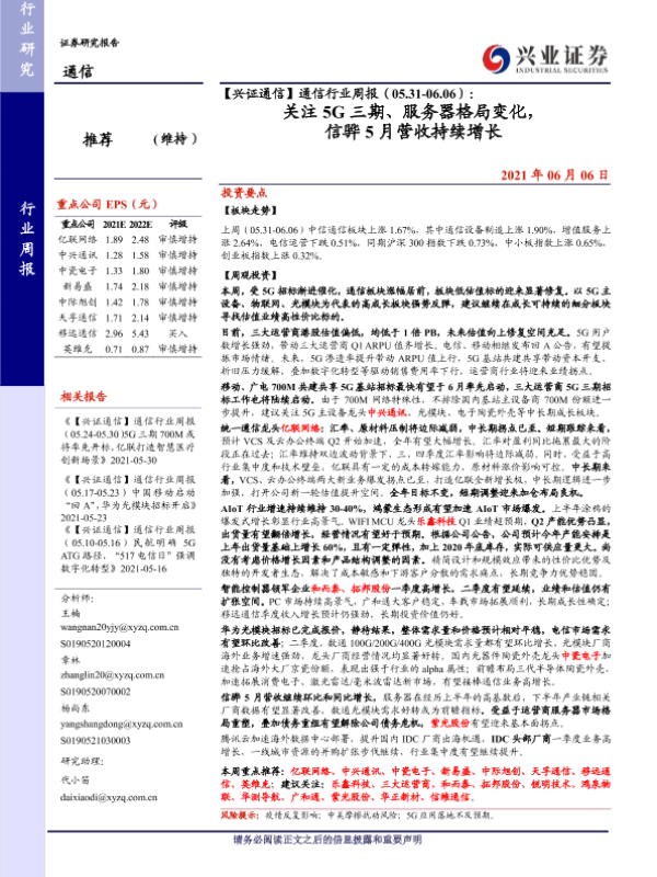 【兴业证券】【20210606】通信行业周报(05.31-06.06):关注5G三期、服务器格局变化,信骅5月营收持续增长-17页