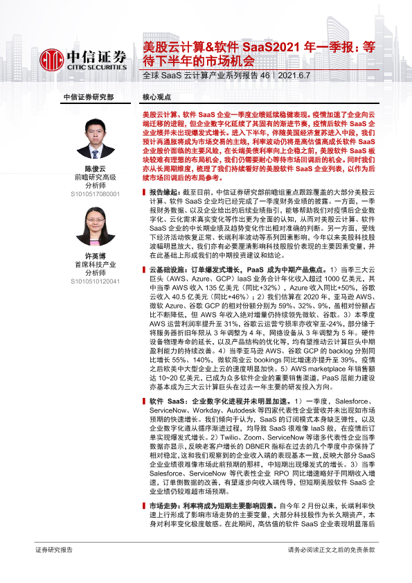 【中信证券】【20210607】美股云计算&软件SaaS2021年一季报:等待下半年的市场机会-16页