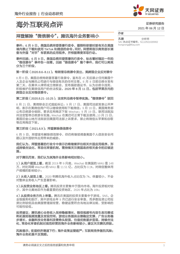 【天风证券】【20210612】海外互联网点评:拜登解除“微信禁令”,腾讯海外业务影响小-3页