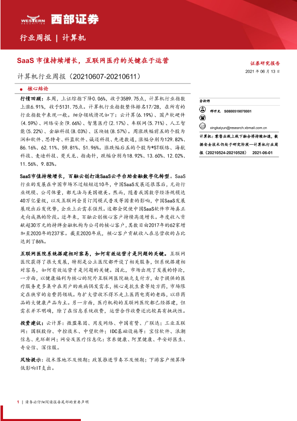 【西部证券】【20210613】20210613-西部证券-计算机行业周报:SaaS市值持续增长,互联网医疗的关键在于运营-16页