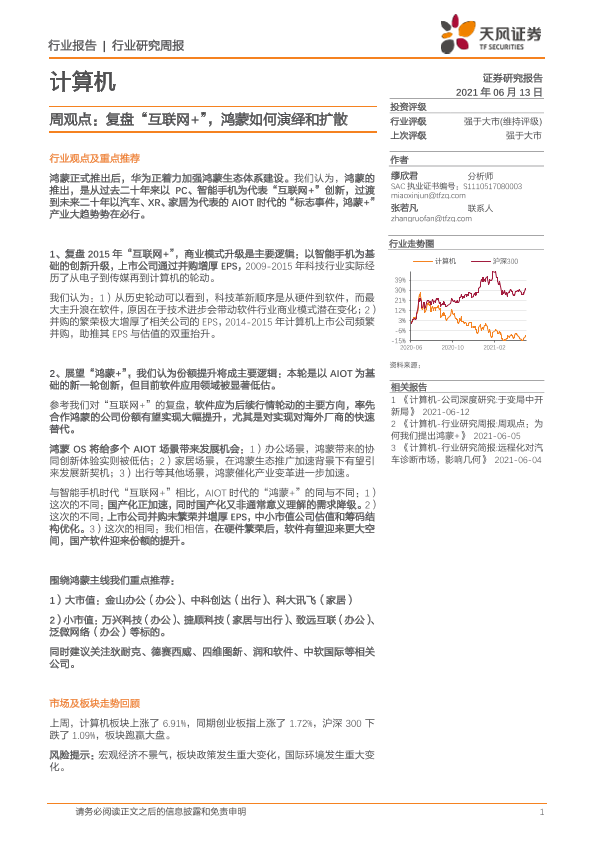 【天风证券】【20210613】20210613-天风证券-计算机周观点:复盘“互联网+”,鸿蒙如何演绎和扩散-8页
