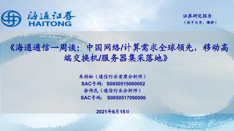 【海通证券】【20210615】海通通信一周谈:中国网络/计算需求全球领先,移动高端交换机/服务器集采落地-11页