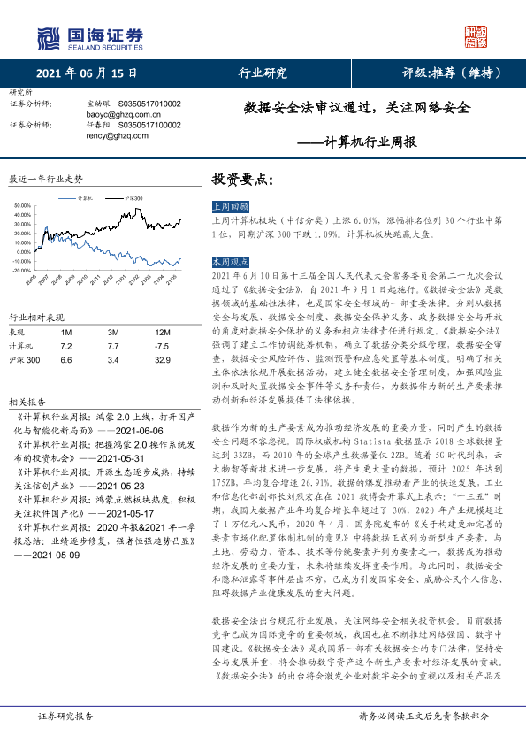 【国海证券】【20210615】计算机行业周报:数据安全法审议通过,关注网络安全-11页