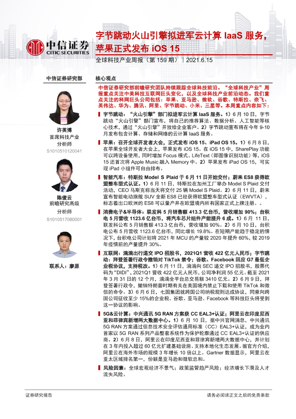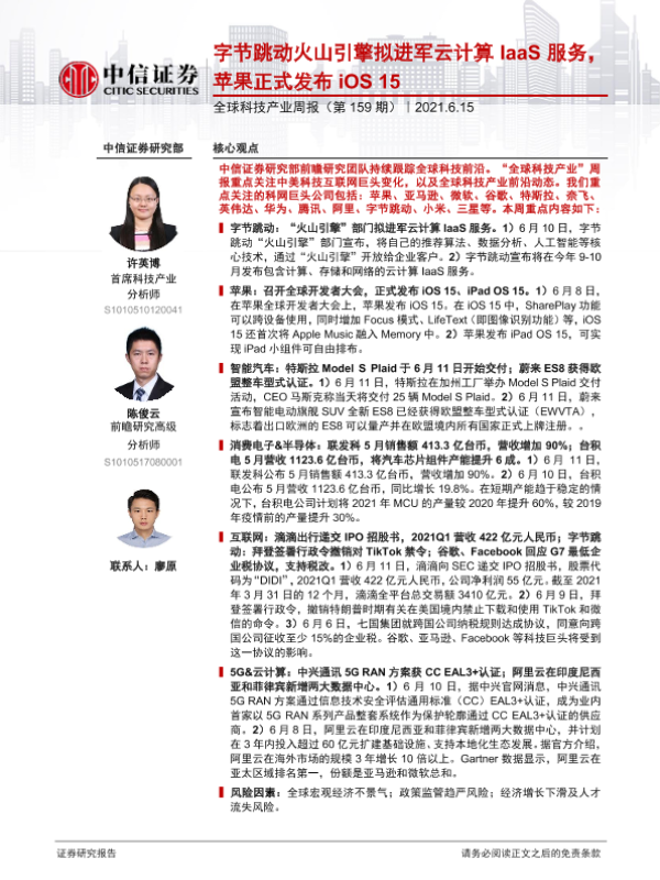 【中信证券】【20210615】全球科技产业周报(第159期):字节跳动火山引擎拟进军云计算IaaS服务,苹果正式发布iOS15-14页