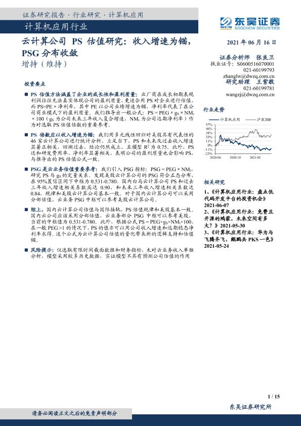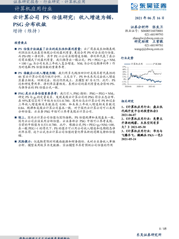 【东吴证券】【20210616】计算机应用行业:云计算公司PS估值研究:收入增速为锚,PSG分布收敛-15页