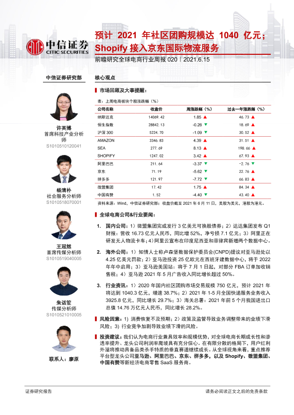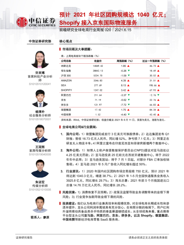 【中信证券】【20210615】20210615-中信证券-前瞻研究全球电商行业周报:预计2021年社区团购规模达1040亿元;Shopify接入京东国际物流服务-20页