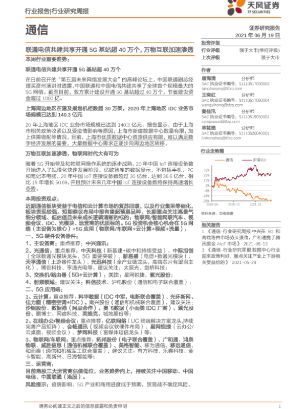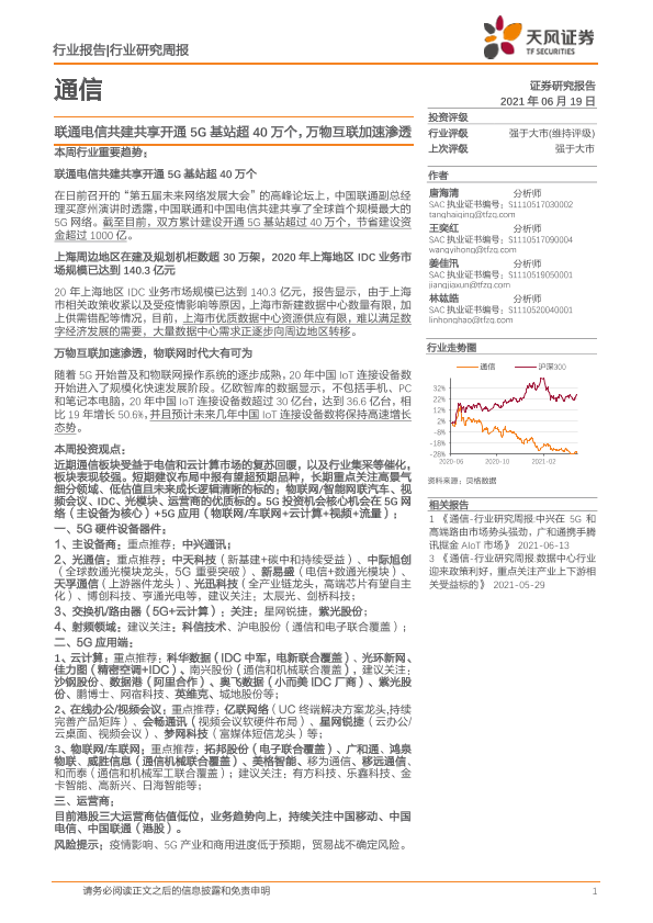 【天风证券】【20210619】通信行业研究周报:联通电信共建共享开通5G基站超40万个,万物互联加速渗透-12页