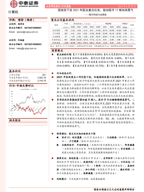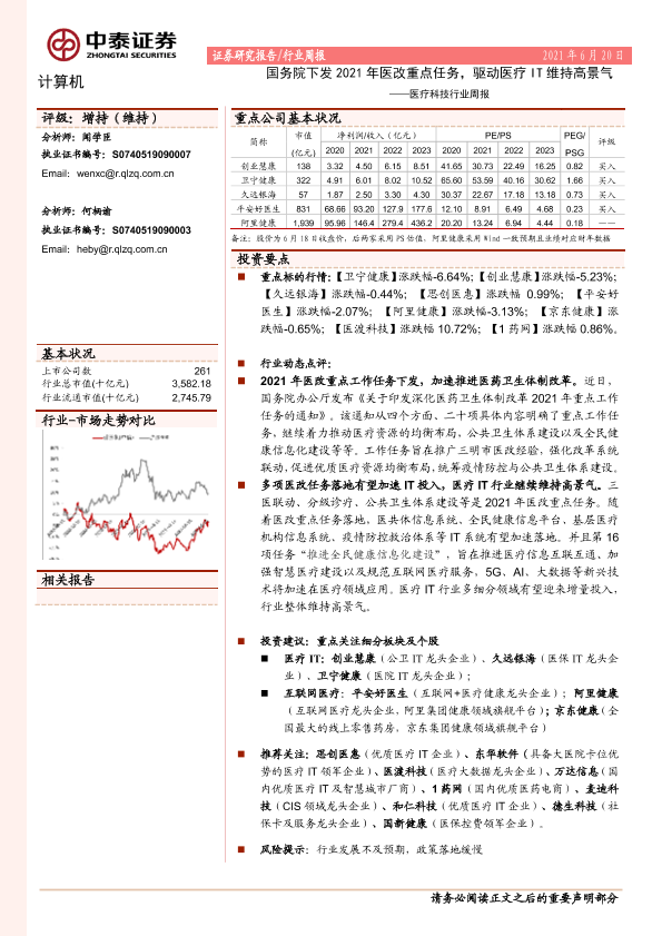 【中泰证券】【20210620】20210620-中泰证券-医疗科技行业周报:国务院下发2021年医改重点任务,驱动医疗IT维持高景气-8页