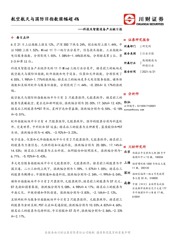 【川财证券】【20210621】科技及智能设备产业链日报:航空航天与国防Ⅲ指数涨幅超4%-4页