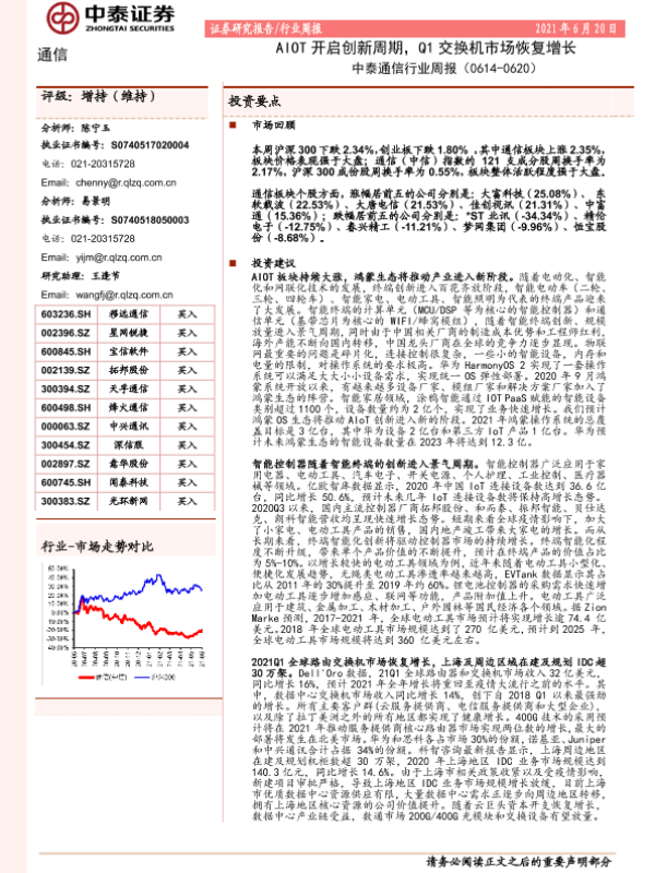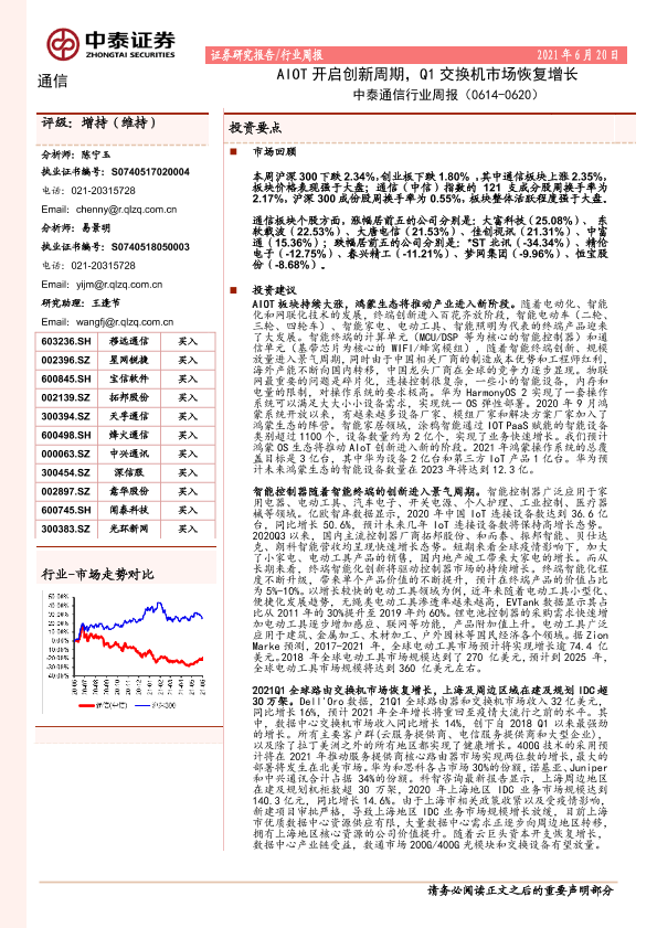 【中泰证券】【20210620】中泰通信行业周报:AIOT开启创新周期,Q1交换机市场恢复增长-13页