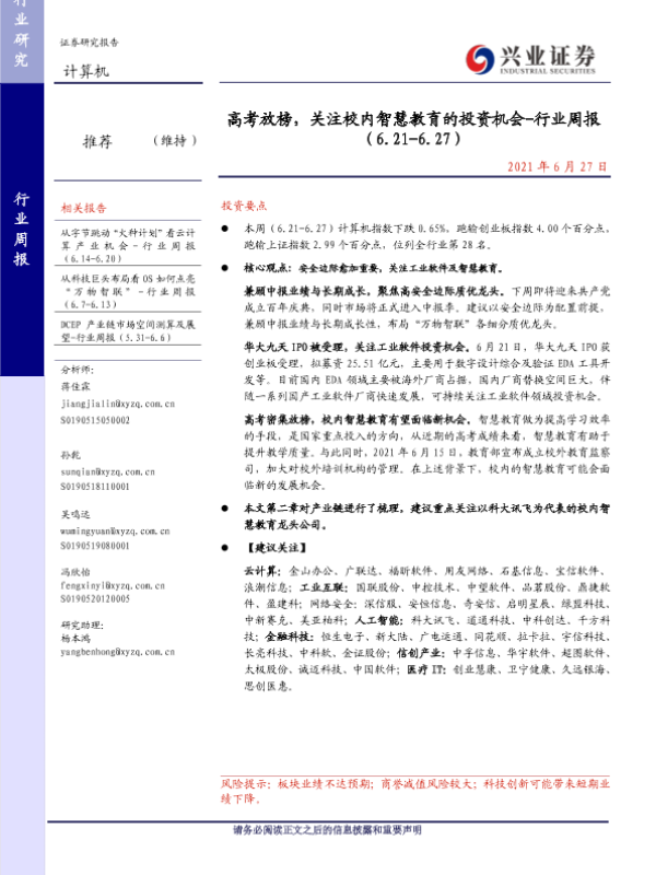 【兴业证券】【20210627】高考放榜,关注校内智慧教育的投资机会-行业周报 (6.21-6.27)-24页