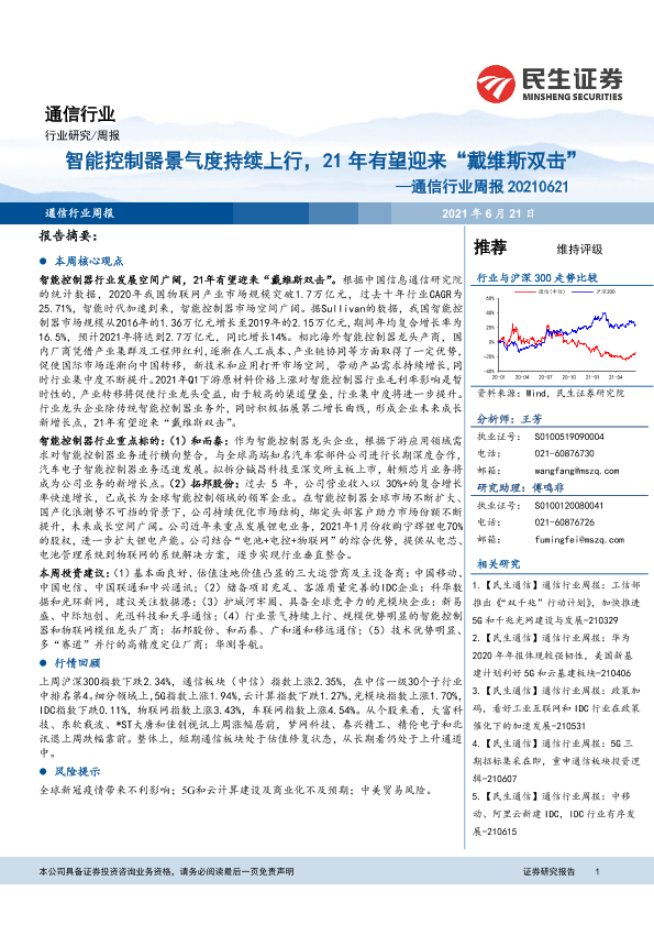 【民生证券】【20210621】20210621-民生证券-通信行业周报:智能控制器景气度持续上行,21年有望迎来“戴维斯双击”-19页