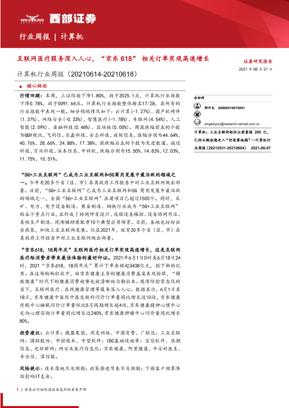 【西部证券】【20210621】20210621-西部证券-计算机行业周报:互联网医疗服务深入人心,“京东618”相关订单实现高速增长-17页