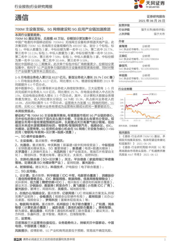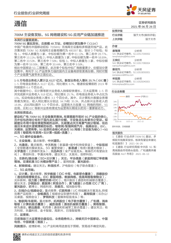 【天风证券】【20210626】通信行业研究周报:700M主设备发标,5G网络建设和5G应用产业链加速推进-14页