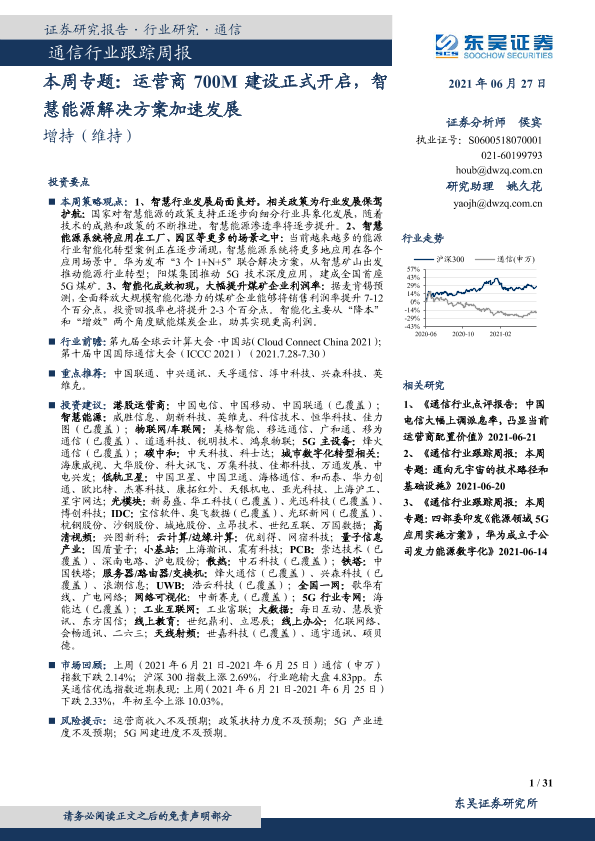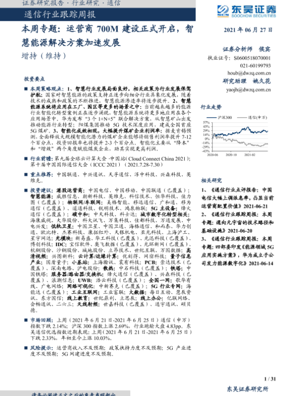 【东吴证券】【20210627】20210627-东吴证券-通信行业跟踪周报:本周专题:运营商700M建设正式开启,智慧能源解决方案加速发展-31页