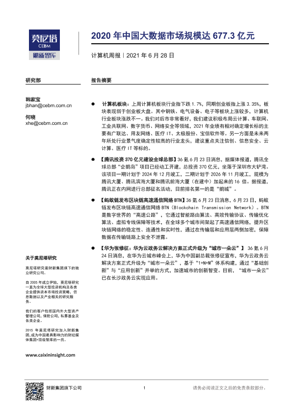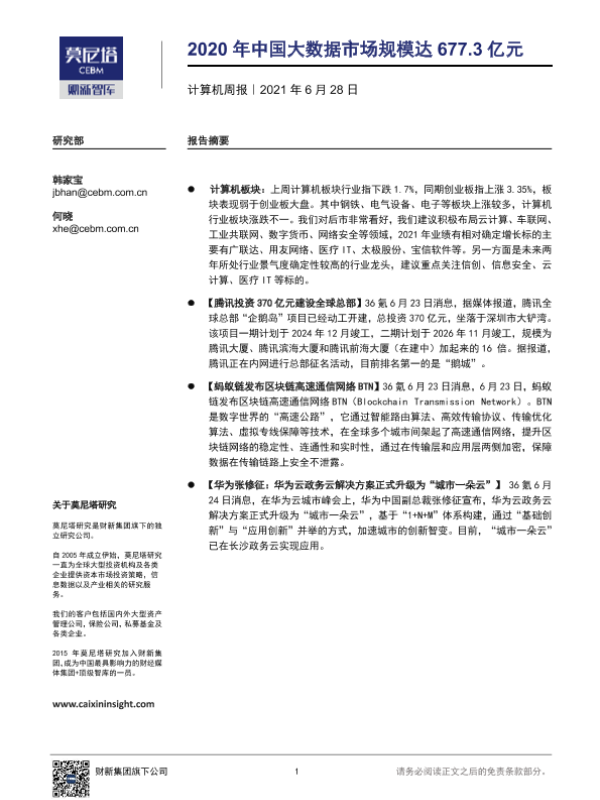 【莫尼塔研究】【20210628】20210628-莫尼塔投资-计算机行业周报:2020年中国大数据市场规模达677.3亿元-7页