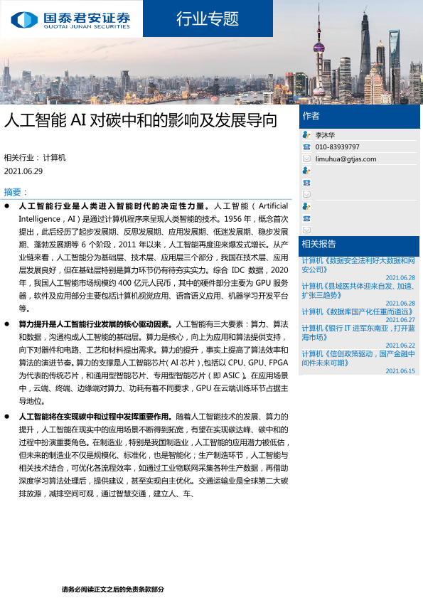 【国泰君安证券】【20210629】20210629-国泰君安-计算机行业专题:人工智能AI对碳中和的影响及发展导向-23页