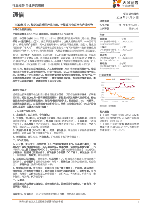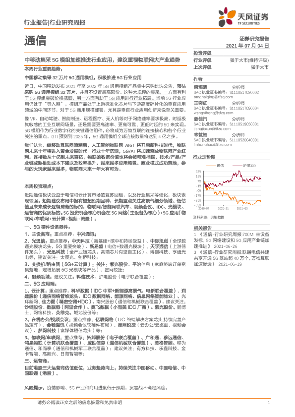 【天风证券】【20210704】通信行业研究周报:中移动集采5G模组加速推进行业应用,建议重视物联网大产业趋势-13页