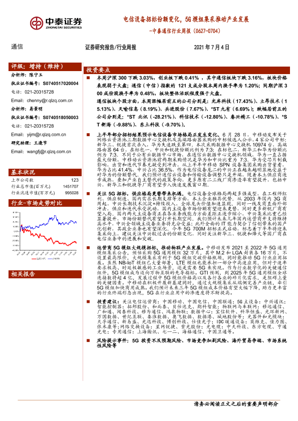 【中泰证券】【20210704】中泰通信行业周报:电信设备招标份额变化,5G模组集采推动产业发展-15页
