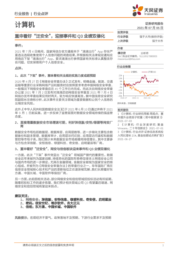 【天风证券】【20210705】20210705-天风证券-计算机行业点评:重申看好“泛安全”,迎接事件和Q3业绩双催化-2页