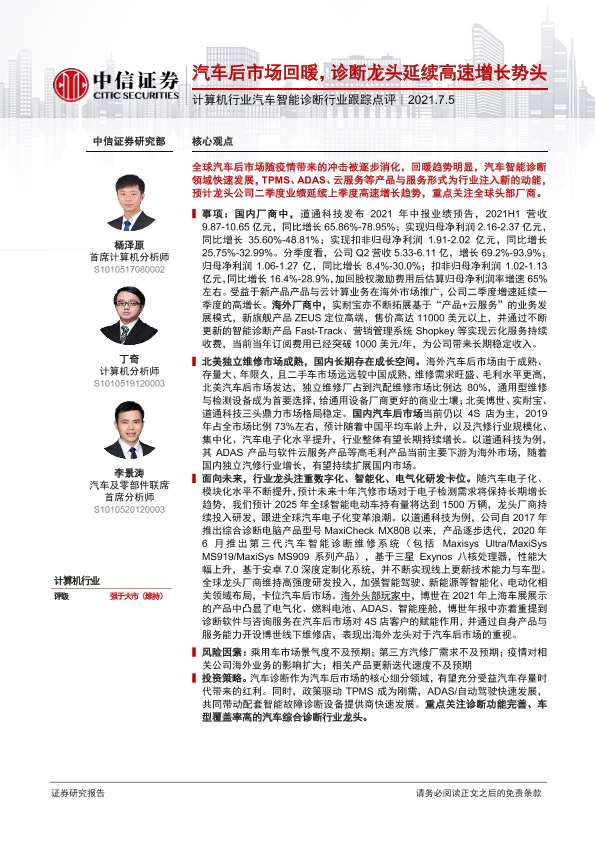 【中信证券】【20210705】计算机行业汽车智能诊断行业跟踪点评:汽车后市场回暖,诊断龙头延续高速增长势头-2页