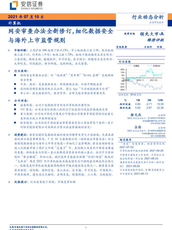 【安信证券】【20210710】计算机行业动态分析:网安审查办法全新修订,细化数据安全与海外上市监管规则-25页