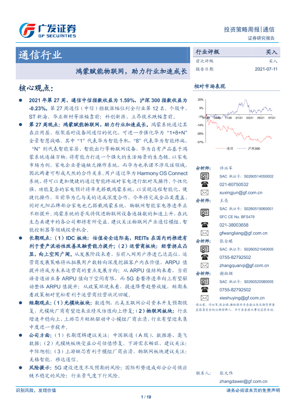【广发证券】【20210711】20210711-广发证券-通信行业投资策略周报:鸿蒙赋能物联网,助力行业加速成长-19页
