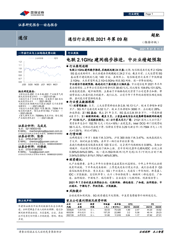 【国信证券】【20210711】通信行业周报2021年第09期:电联2.1GHz建网稳步推进,中兴业绩超预期-15页