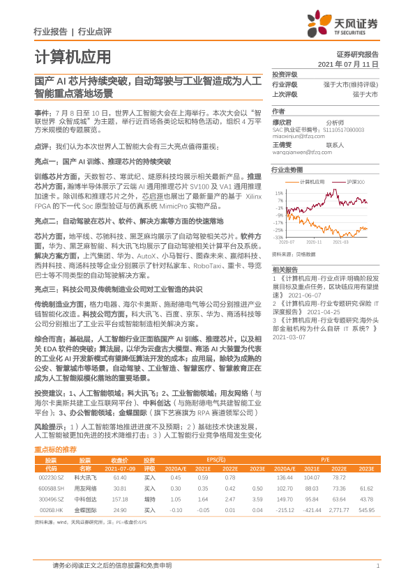 【天风证券】【20210711】计算机应用:国产AI芯片持续突破,自动驾驶与工业智造成为人工智能重点落地场景-4页
