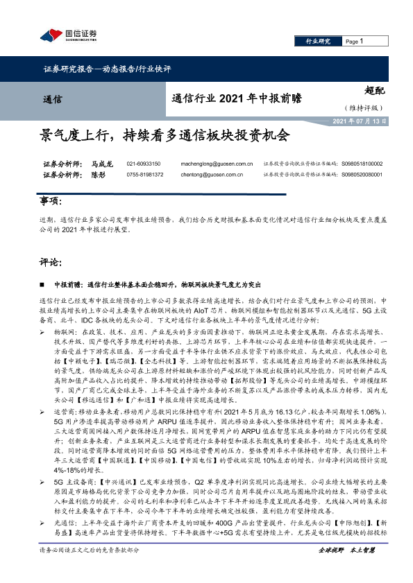 【国信证券】【20210713】通信行业2021年中报前瞻:景气度上行,持续看多通信板块投资机会-5页