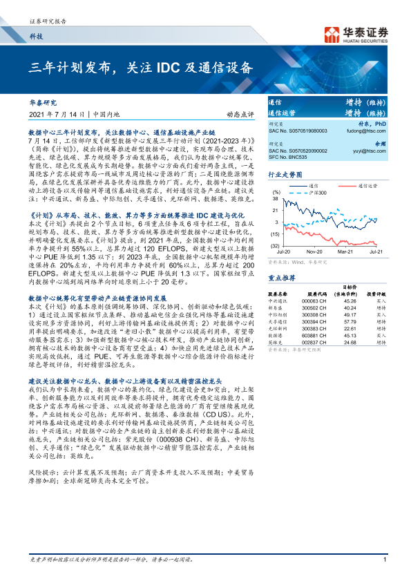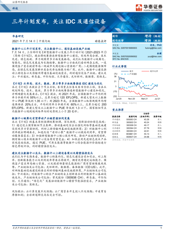 【华泰证券】【20210714】科技:三年计划发布,关注IDC及通信设备-7页