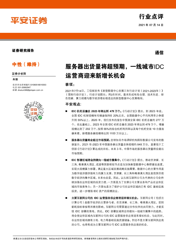 【平安证券】【20210714】通信:服务器出货量将超预期,一线城市IDC运营商迎来新增长机会-3页