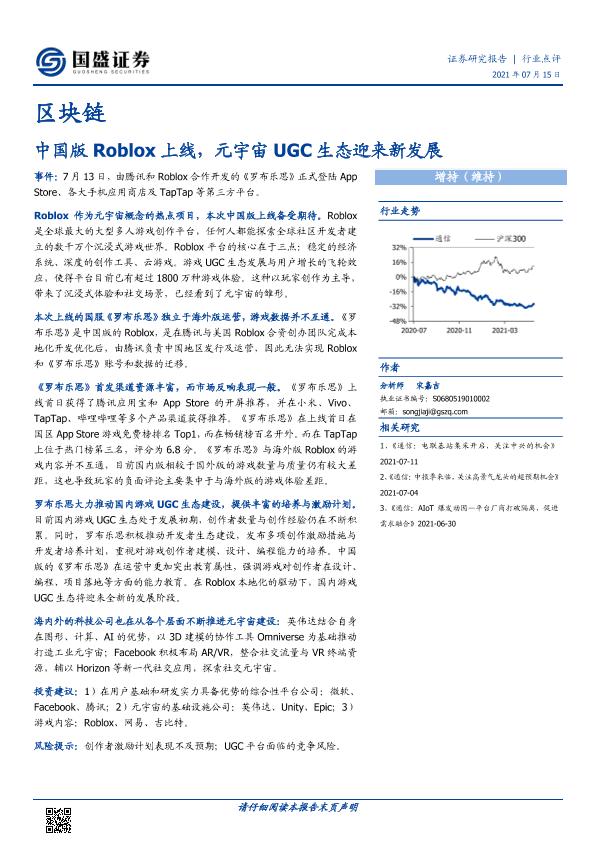 【国盛证券】【20210715】区块链行业点评:中国版Roblox上线,元宇宙UGC生态迎来新发展-2页